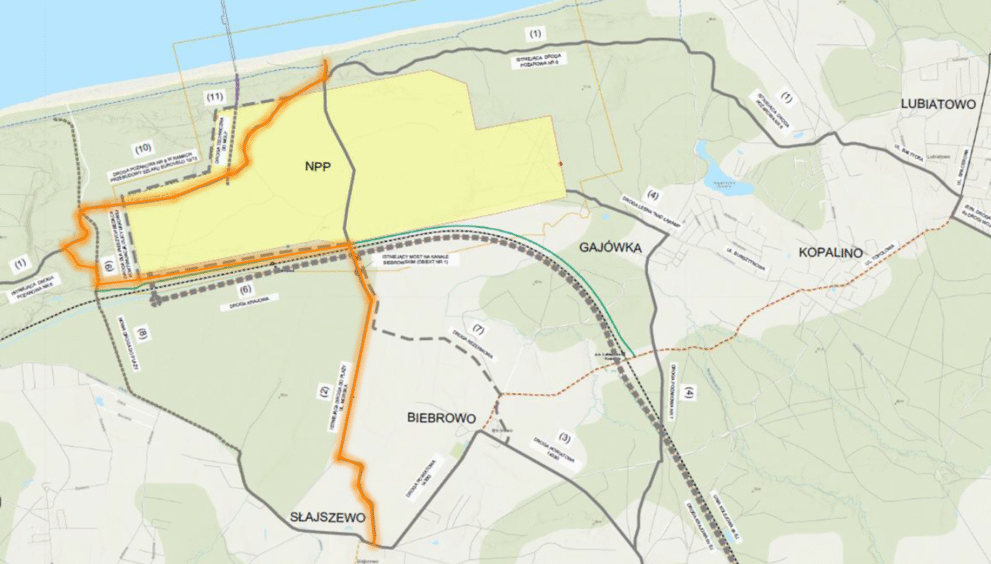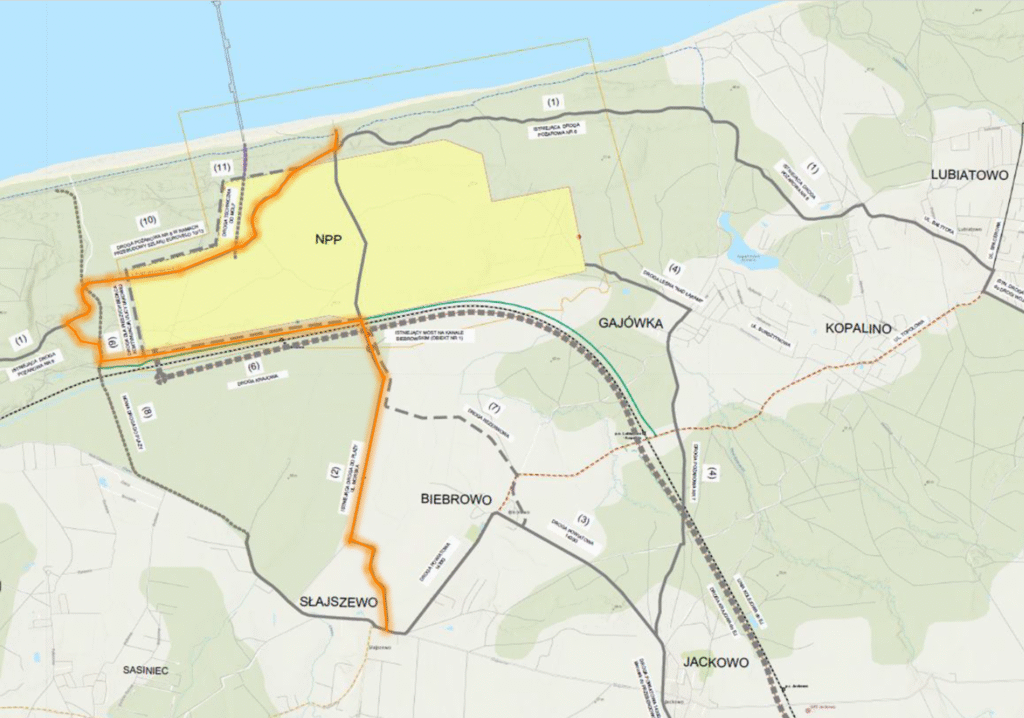 Trwają prace przygotowawcze na terenie przewidzianym pod budowę elektrowni jądrowej. Osoby zmierzające na plażę od strony Słajszewa powinny w tej okolicy zachować szczególną ostrożność i zwracać uwagę na informacje zamieszczone na tablicach ostrzegawczych. Pracownicy ochrony w wyznaczonych punktach wokół terenu prac są gotowi wskazać najlepszą trasę dotarcia do plaży. Dojście na plażę od Słajszewa ulicą Morską jest nadal dostępne dla pieszych, rowerzystów i turystów poruszających się meleksami. Szlaban, ustawiony pod koniec listopada w okolicy przeprawy przez Kanał Biebrowski służy jedynie ograniczeniu ruchu samochodowego. Zgodnie z sugestiami mieszkańców, jest on obecnie w ciągu dnia ciągle otwarty, a pracownicy ochrony są zobowiązani umożliwić przejście wszystkim osobom udającym się na plażę. Przejście w tym miejscu będzie zamykane szlabanem w godzinach nocnych i ponownie otwierane o godzinie 07:00 rano. Może być także zamknięte w sytuacji, gdy na obszarze realizacji inwestycji będą prowadzone prace mogące zagrażać bezpieczeństwu osób poruszających się tą drogą.