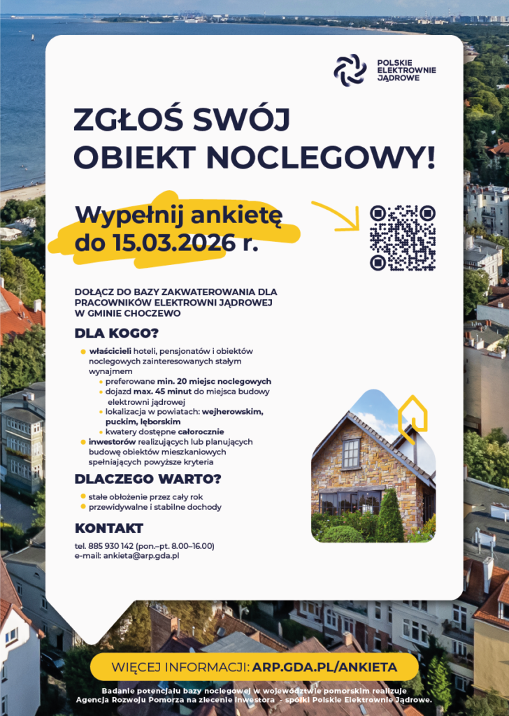 Analizę dostępnej bazy noclegowej na zlecenie Polskich Elektrowni Jądrowych przeprowadzi Agencja Rozwoju Pomorza. Obejmie ona zarówno istniejące obiekty, jak i inwestycje planowane oraz w trakcie realizacji. Głównymi kryteriami wyboru będą m.in. lokalizacja obiektu noclegowego w powiecie puckim, wejherowskim lub lęborskim oraz dogodny dojazd do placu budowy (nie dłuższy niż 45 minut).