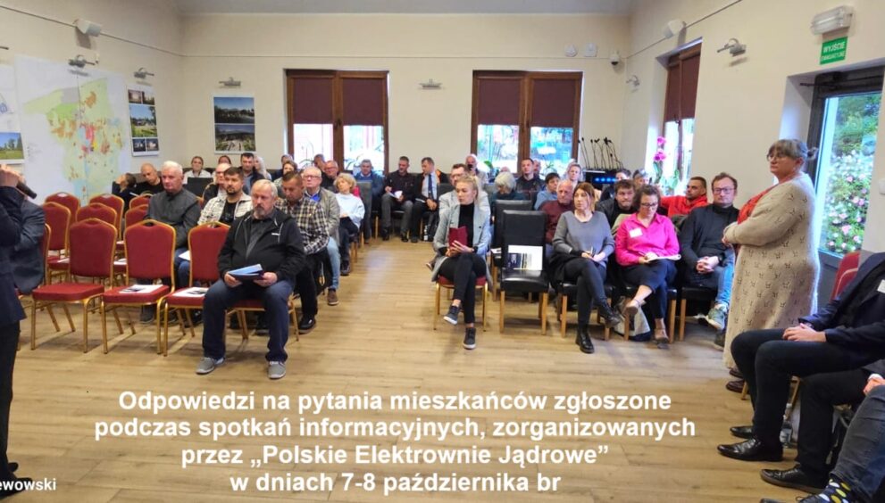 Podczas spotkań informacyjnych przedstawicieli „Polskich Elektrowni Jądrowych” (PEJ) z mieszkańcami gminy Choczewo, jakie odbyły się w dn. 7 i 8 października br w Słajszewie i Choczewie padło wiele pytań, na które Spółka zobowiązała się odpowiedzieć pisemnie. Poniżej publikujemy pełny tekst materiału otrzymanego właśnie z PEJ, zawierającego odpowiedzi na wszystkie poruszone wówczas kwestie i pytania…
