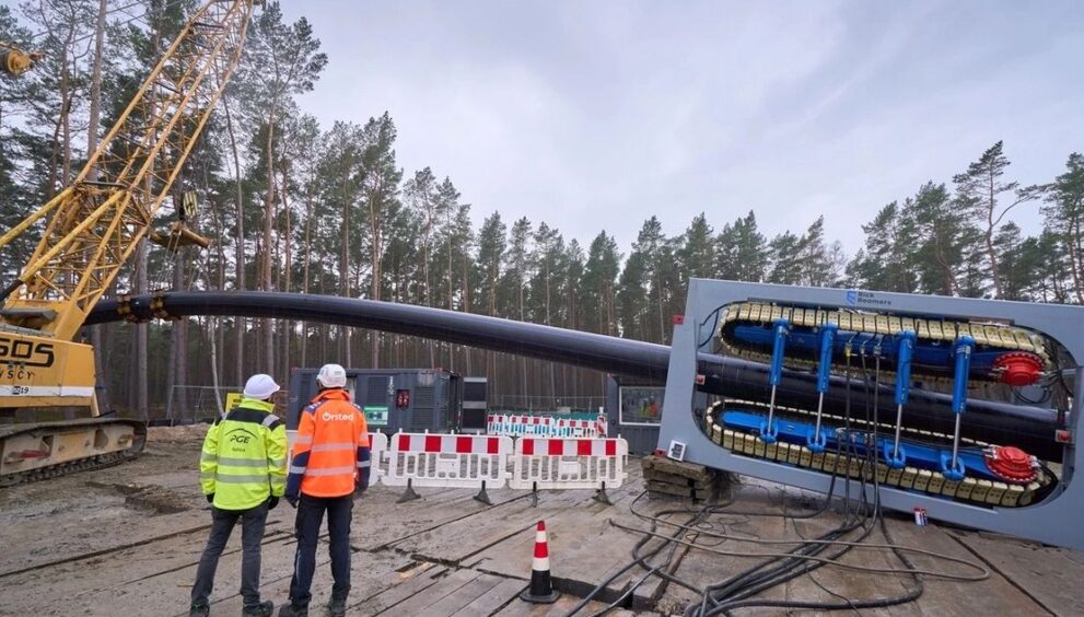 Prace trwały dziewięć miesięcy [od lipca 2025 roku] i obejmowały przygotowanie czterech kanałów kablowych o średnicy 800 mm i długości około 1240 m każdy. Łącznie powstało więc blisko 5 km infrastruktury, która w przyszłości poprowadzi energię z morza do krajowej sieci. Rury montowano z 18‑metrowych odcinków, zgrzewanych doczołowo na placu budowy. Sama prefabrykacja wymagała 42 transportów komponentów, a prace prowadzono w warunkach, które potrafiły zmieniać się z dnia na dzień – od letnich upałów po zimowe mrozy sięgające -20°C, przy śniegu, oblodzeniu i silnym wietrze.