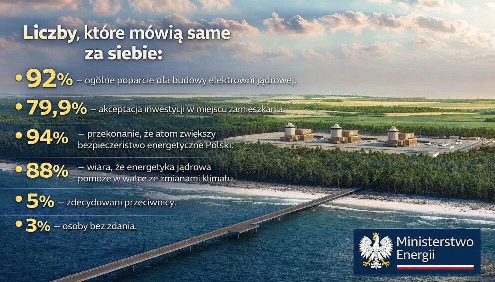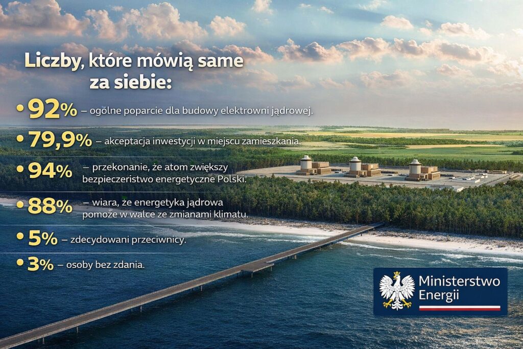 Energetyka jądrowa w Polsce jeszcze nigdy nie miała tak silnego społecznego zaplecza. Najnowszy ogólnopolski sondaż przeprowadzony na zlecenie Ministerstwa Energii pokazuje, że aż 92 % Polaków popiera budowę elektrowni jądrowej w kraju. Co więcej, prawie 80 % ankietowanych zgadza się na inwestycję w swojej okolicy – wynik, który w przypadku dużych projektów infrastrukturalnych należy do rzadkości…