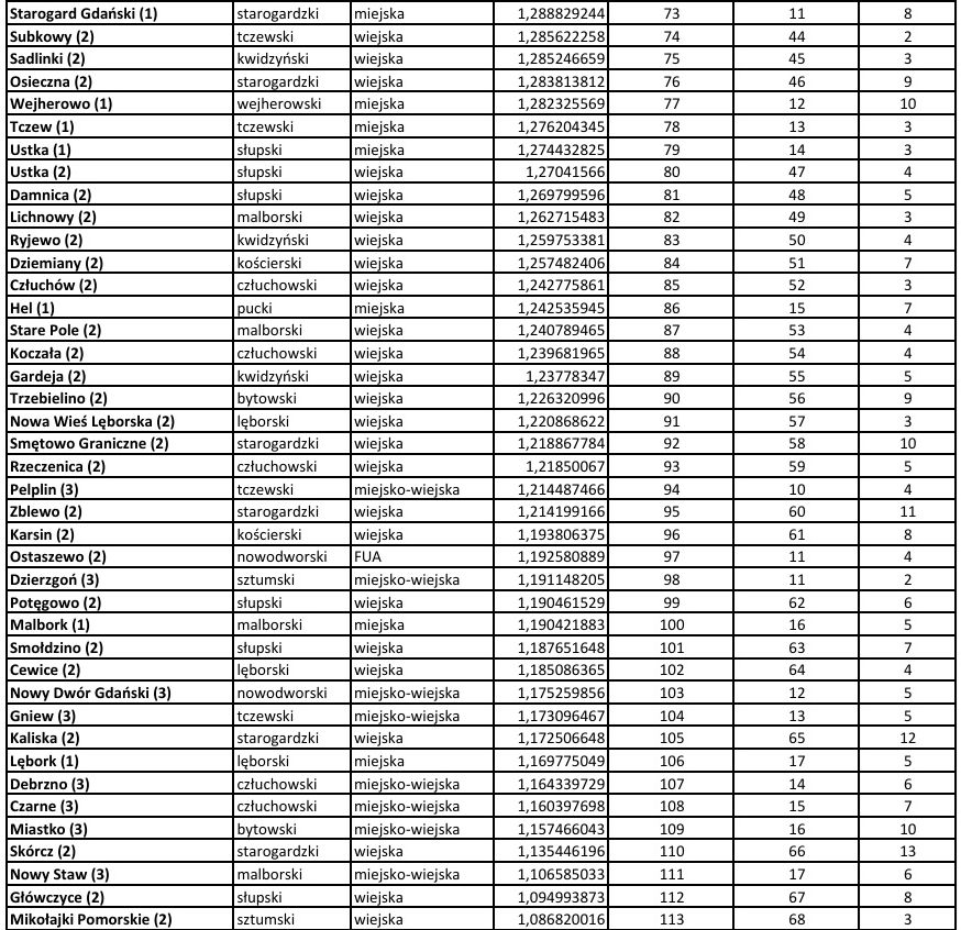 Listopad to czas różnego rodzaju rankingów miast i gmin… Najpierw, w raporcie opracowanym przez firmę „Algolytics Technologies” we współpracy z Agencją Badawczą „SW Research”, gdzie pod uwagę wzięto m.in. analizę aż 90 wskaźników pogrupowanych w 10 kategoriach tematycznych, na 2477 gmin miejskich i wiejskich całego kraju – gmina Choczewo zajęła odległe 2416 miejsce. Nieco później, w rankingu redakcji „Rzeczpospolita”, którego celem była ocena skuteczności działań władz miast i gmin na rzecz zrównoważonego rozwoju wspólnot lokalnych, w stawce 1464 gmin wiejskich – gmina Choczewo uplasowała się już na 69 miejscu (3 w województwie pomorskim). I wreszcie kilka dni temu, Fundacja Rozwoju Demokracji Lokalnej im. Jerzego Regulskiego (Ośrodek Regionalny w Gdańsku) opublikowała wyniki najnowszego „Rankingu Gmin Województwa Pomorskiego”, którego podstawowym celem jest wyłonienie i promocja gmin wyróżniających się pod względem rozwoju społeczno-gospodarczego… Jak wypadła w nim nasza gmina, która przed rokiem, w stawce 119 gmin była na 20 miejscu i 6 w powiecie wejherowskim, a wśród gmin wiejskich na 4 ?