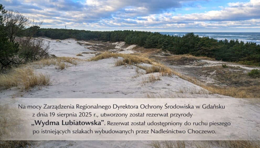 Nadleśnictwo Choczewo poinformowało o utworzeniu… rezerwatu przyrody „Wydma Lubiatowska”. Decyzja została podjęta na mocy zarządzenia Regionalnego Dyrektora Ochrony Środowiska w Gdańsku z 19 sierpnia 2025 roku. Od dn. 9 stycznia br rezerwat jest udostępniony do ruchu pieszego, jednak wyłącznie po istniejących szlakach przygotowanych przez nadleśnictwo. Łączna powierzchnia rezerwatu wraz z otuliną wynosi 207 hektarów. Nadleśnictwo przypomina, że przed nadchodzącym sezonem turystycznym obowiązuje zasada poruszania się wyłącznie po wyznaczonych szlakach na terenie rezerwatu „Wydma Lubiatowska”. Podkreśla również, że przestrzeganie zasad jest kluczowe dla ochrony tego wyjątkowego obszaru…